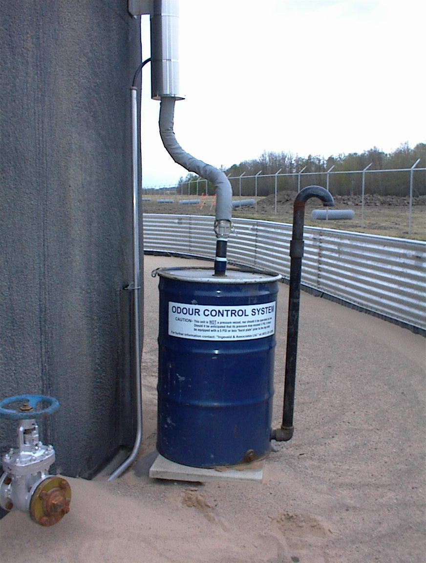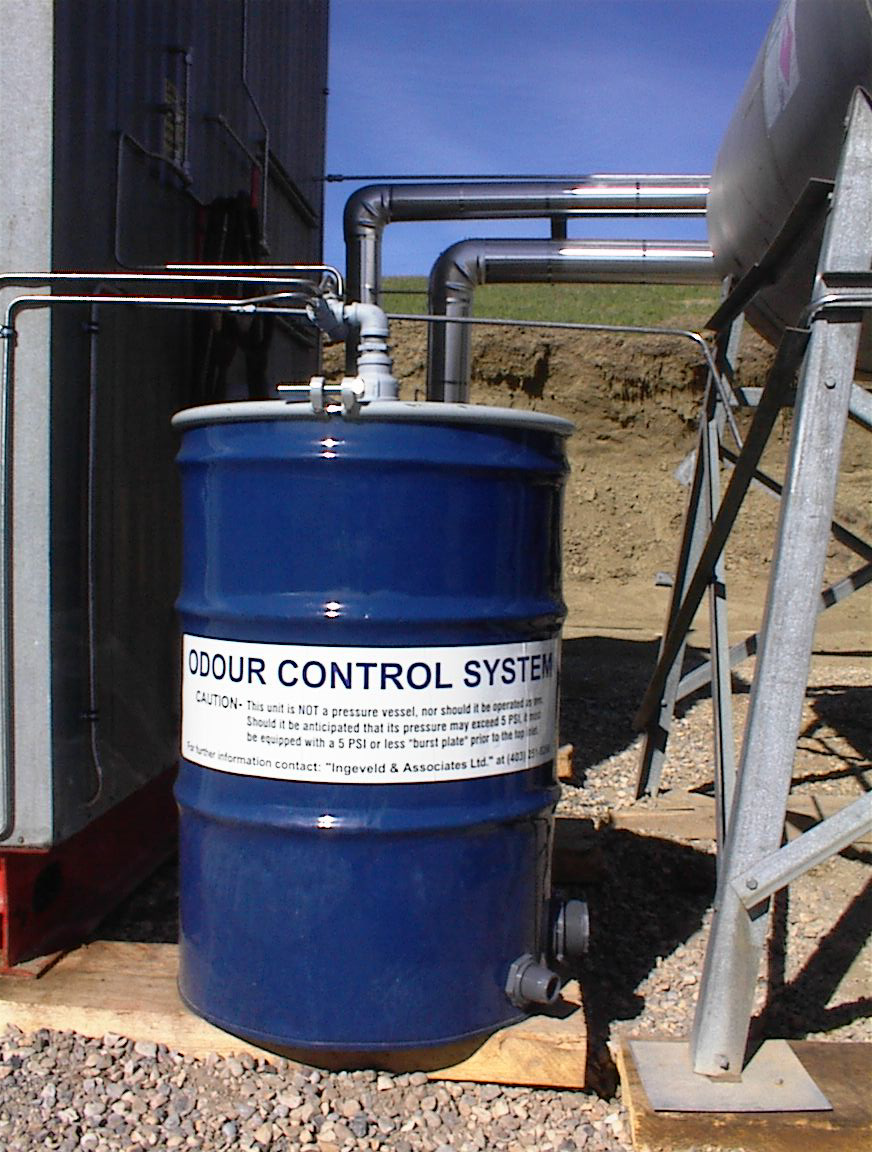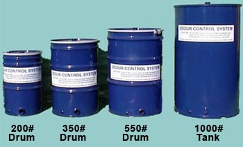 Our "Odour Control System" consists of various sized (off-the-shelf) containers. Each is equipped with a removable lid, inlet vapour deflector, outlet vapour gathering tube, and drain.